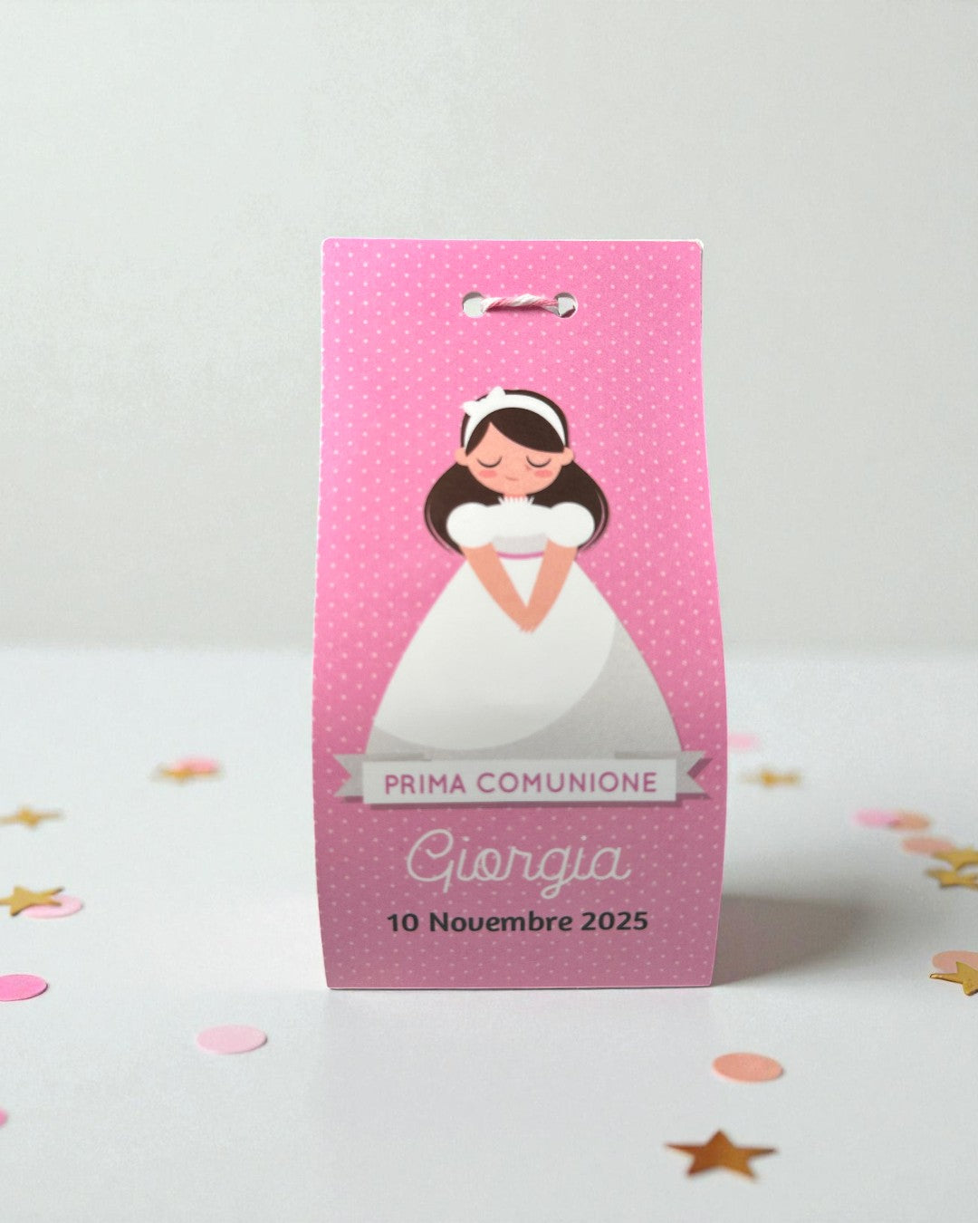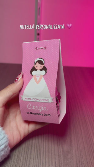 La scatolina, decorata nei toni del rosa con una graziosa bambina in abito bianco, è personalizzata con nome e data dell’evento, perfetta per custodire la mini Nutellina o un piccolo pensiero.