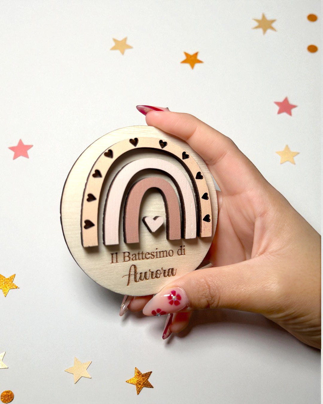 Dolcissima calamita in legno con arcobaleno personalizzato, ideale come bomboniera per battesimo, nascita o comunione.