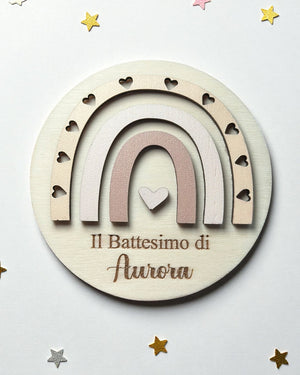 Realizzata in legno naturale di alta qualità, la calamita raffigura un arcobaleno dai toni pastello con piccoli cuori incisi e la scritta personalizzata “Il Battesimo di [Nome]”.