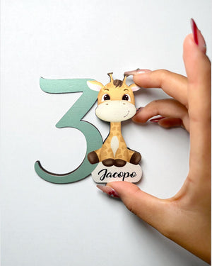 La calamita raffigura una graziosa giraffa dal sorriso dolce, abbinata a un numero o lettera personalizzabile e al nome del bambino inciso o stampato sul fronte.